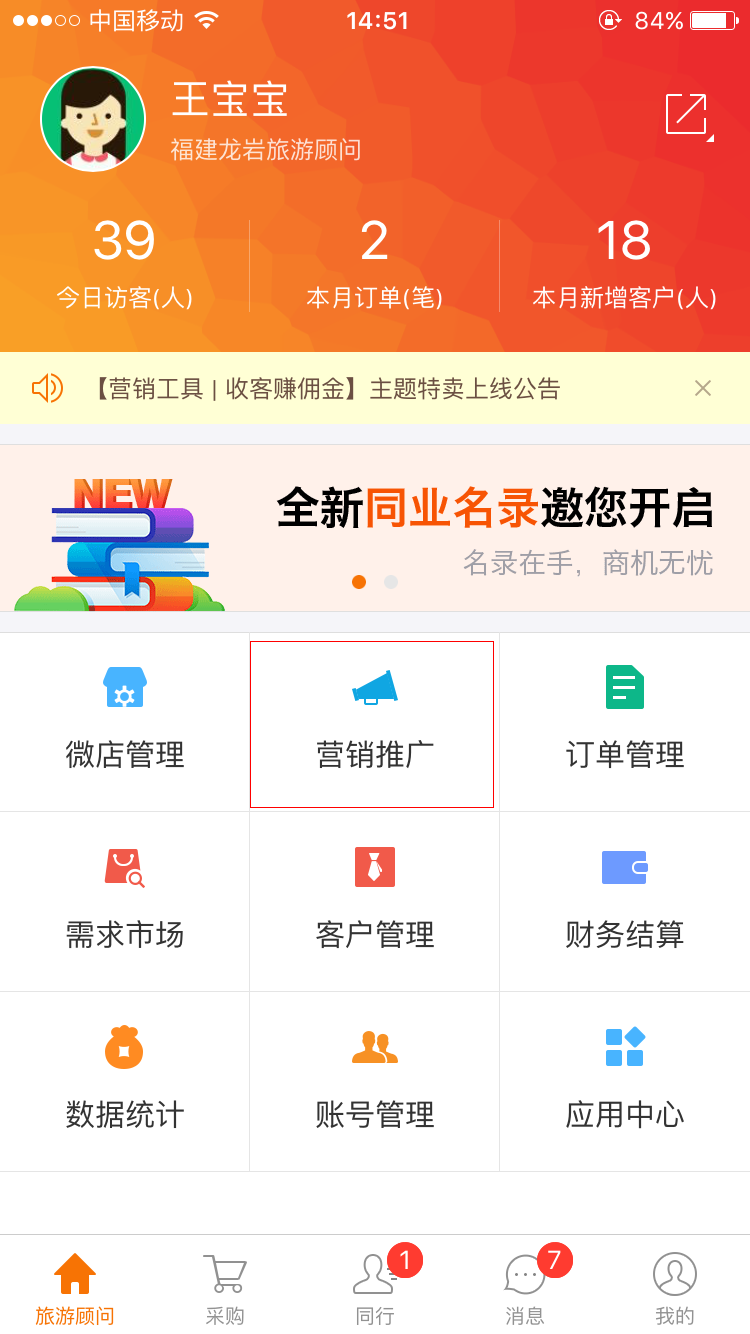 1)打开同业APP,进入【营销推广】