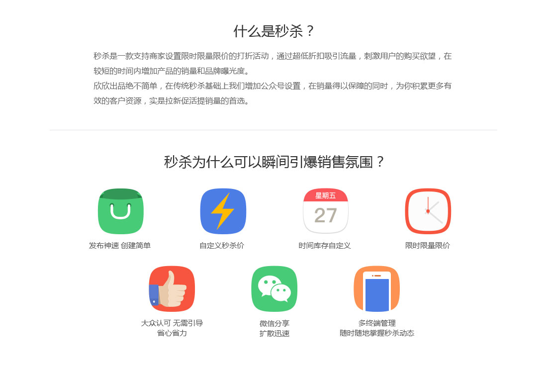 秒杀是能够瞬间引爆销量的营销助手,期待给您带来不一样的销售机遇和体验。
